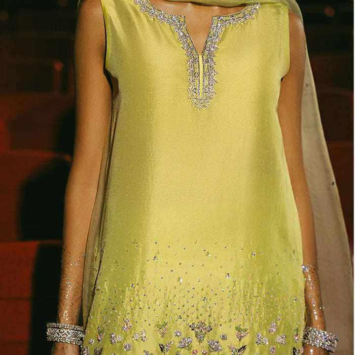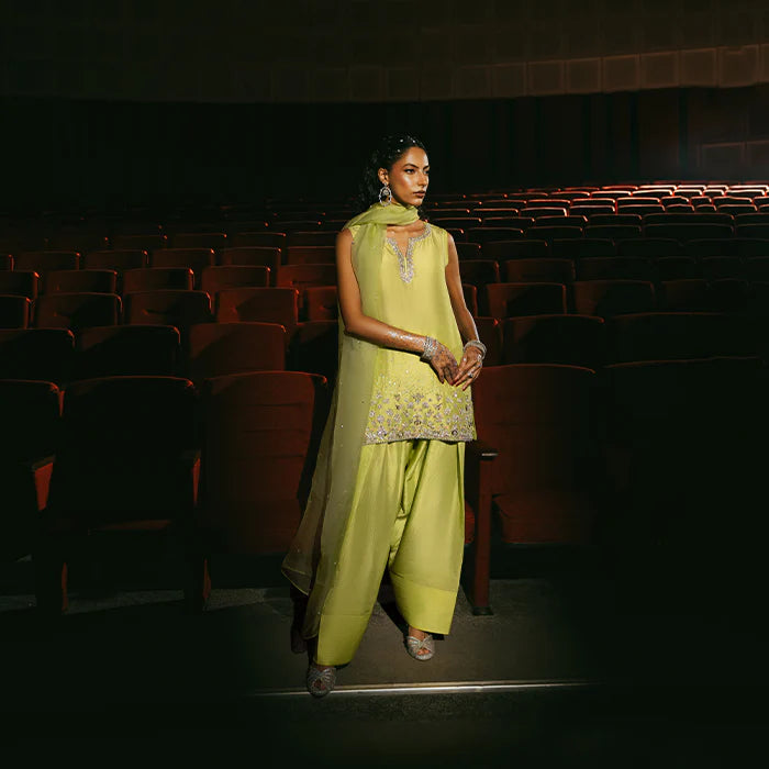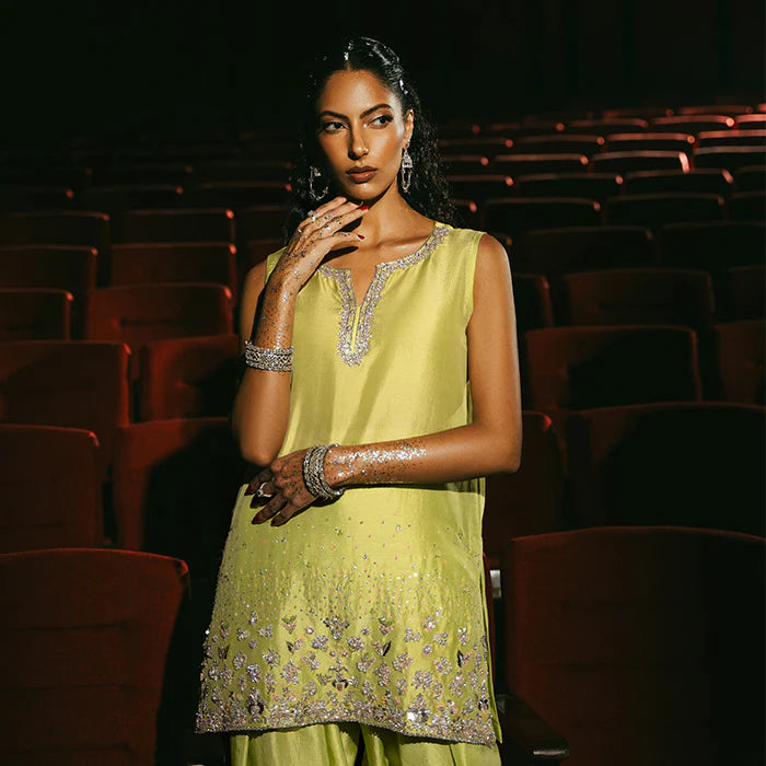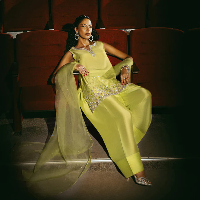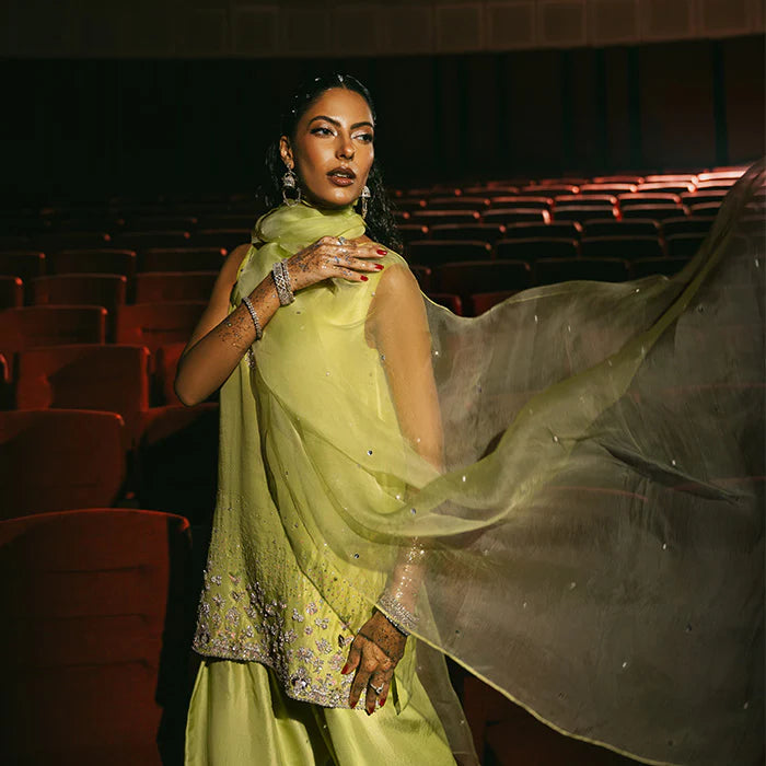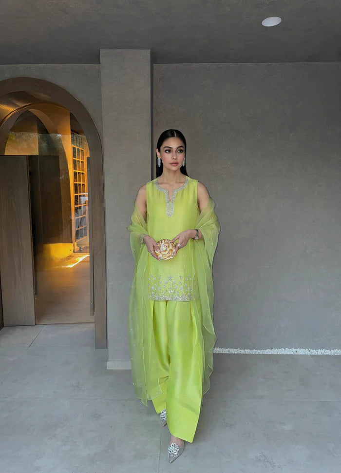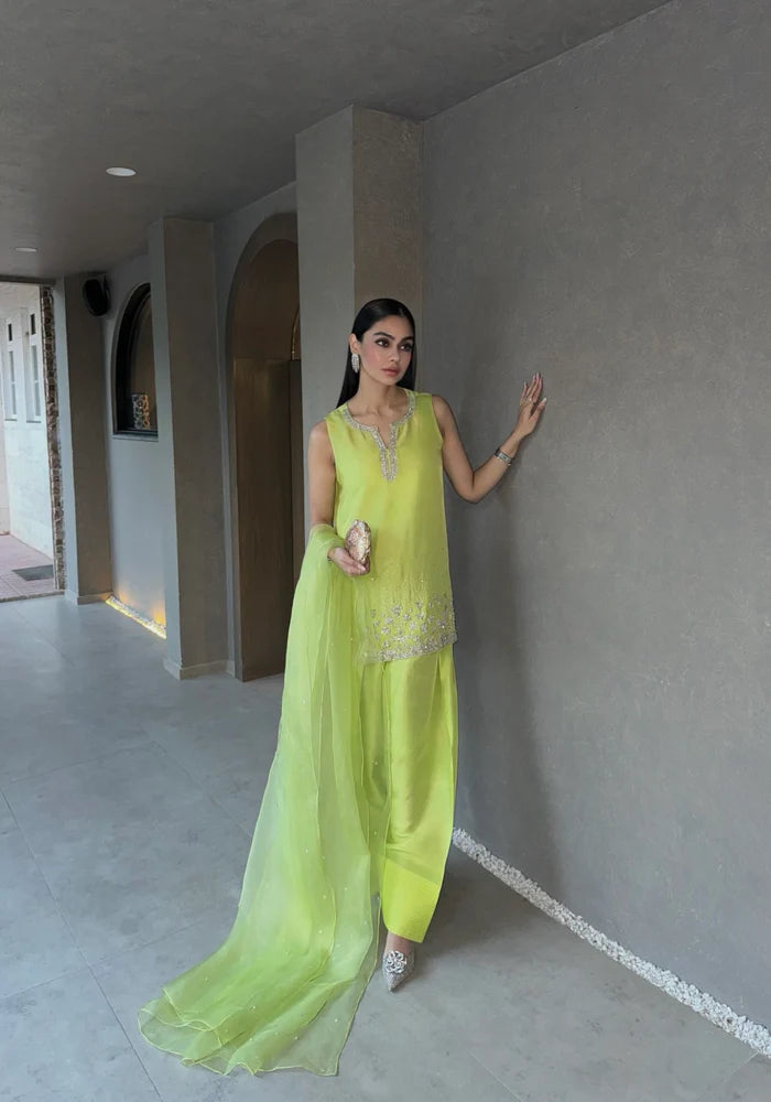 Vibrantly adorned in a striking parrot green, this pure raw silk shalwar kameez features exquisite hand-embellished details that add a contemporary touch to traditional elegance. The intricate embellishments create a glamorous visual appeal, making it a statement piece. Finished off with a graceful organza dupatta, this outfit is perfect for making an impression.