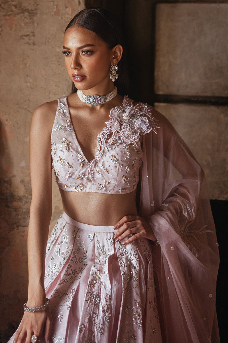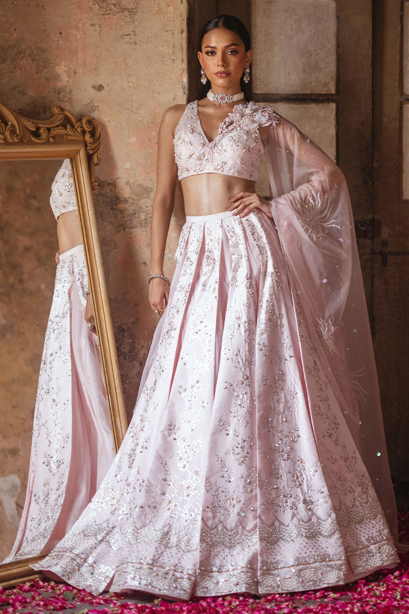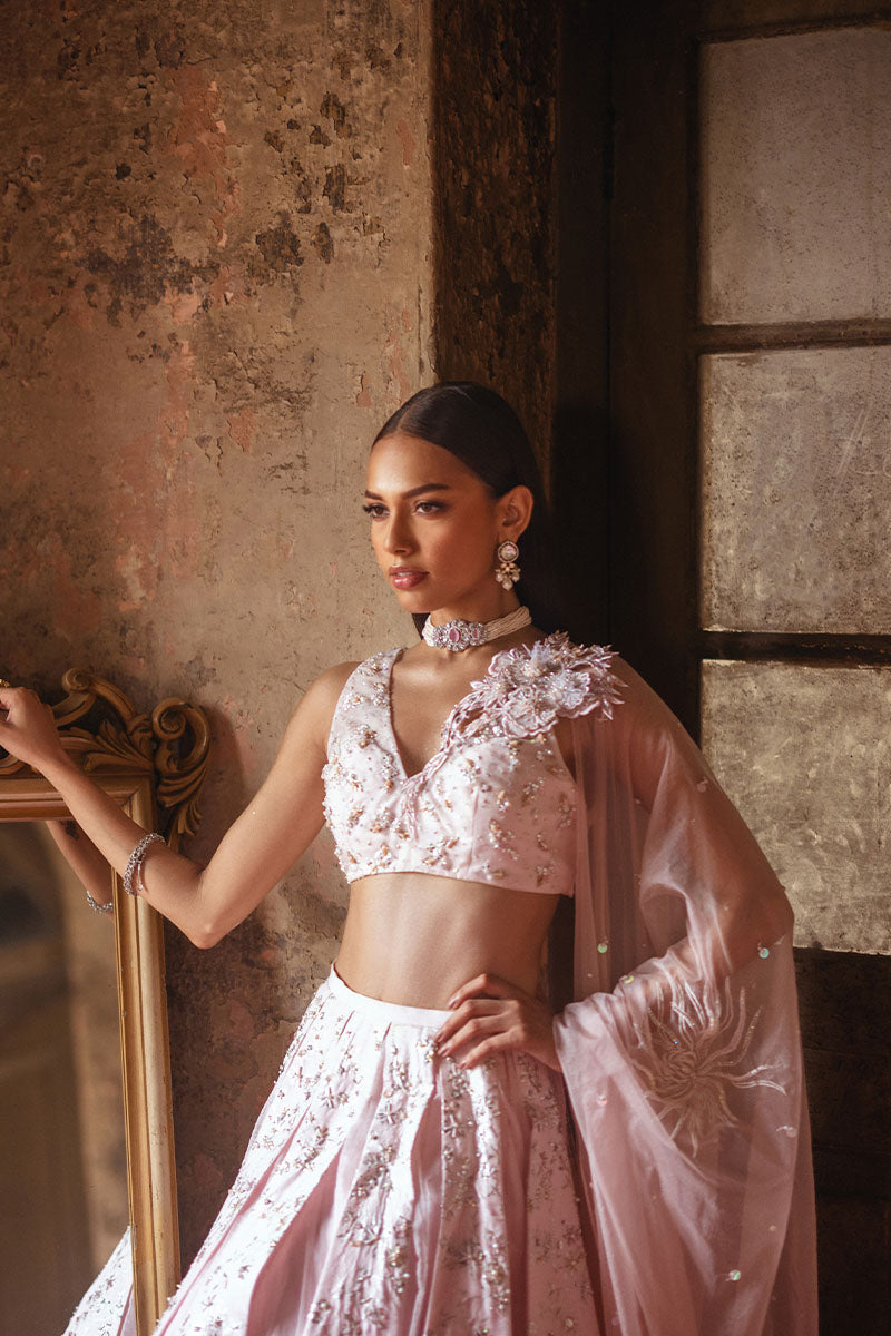 This enchanting outfit features a powder pink contemporary blouse adorned with intricate 3D floral work, complemented by delicate embellishments of pearls and crystals. The blouse is paired with a crushed organza lehenga, elegantly overlapped with embellished screen-printed panels that add depth and texture. Completing the look is an organza dupatta, embellished with matching pearls and crystals, which drapes gracefully to enhance the ensemble’s sophisticated charm.