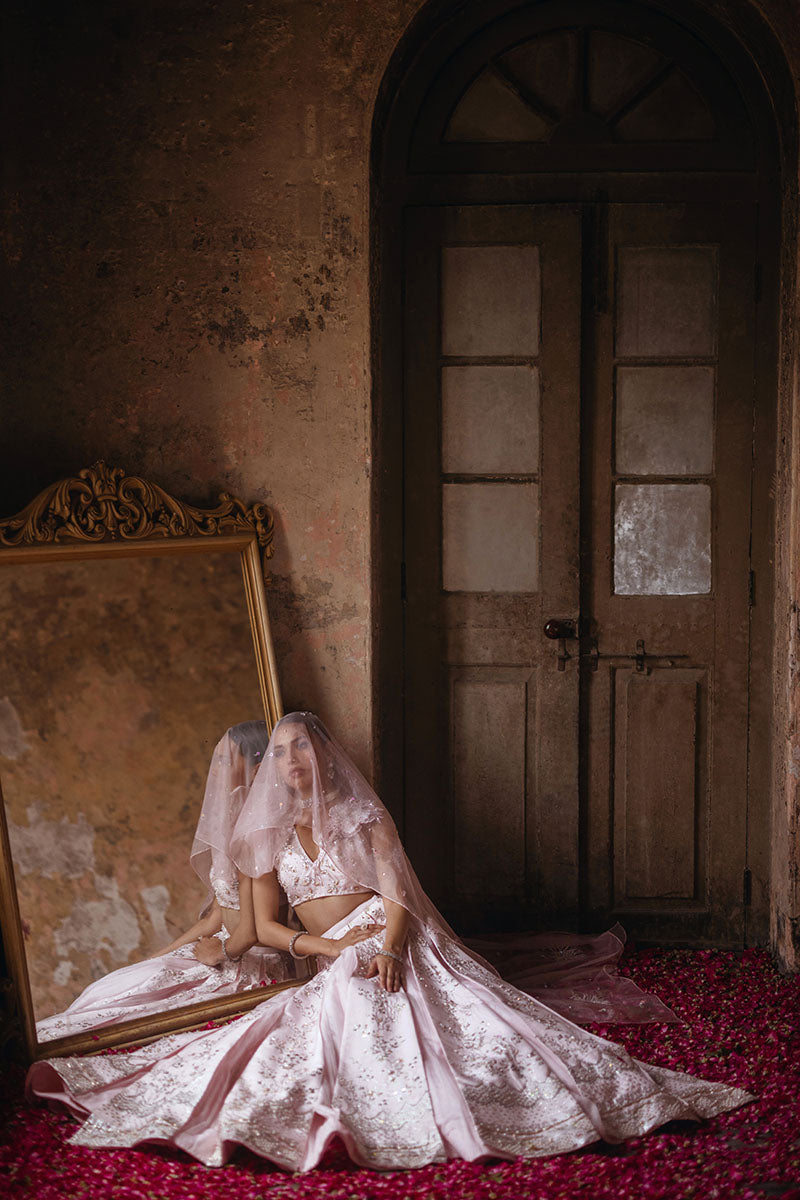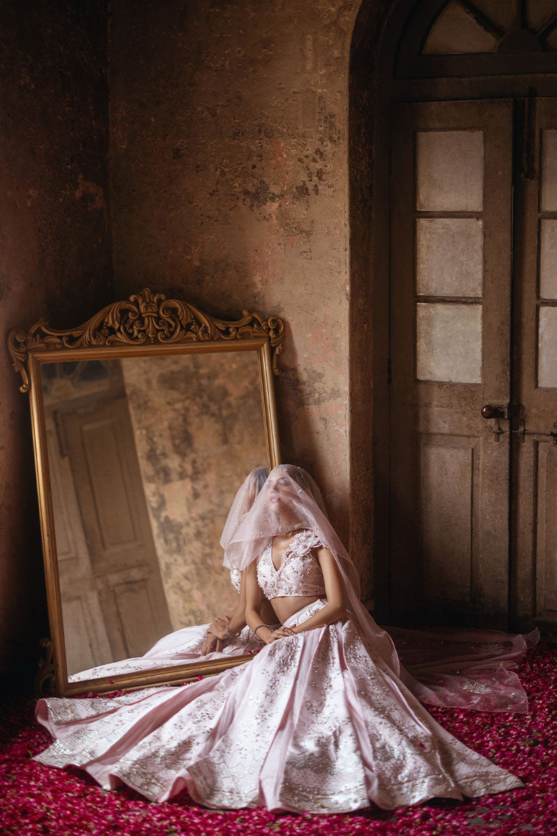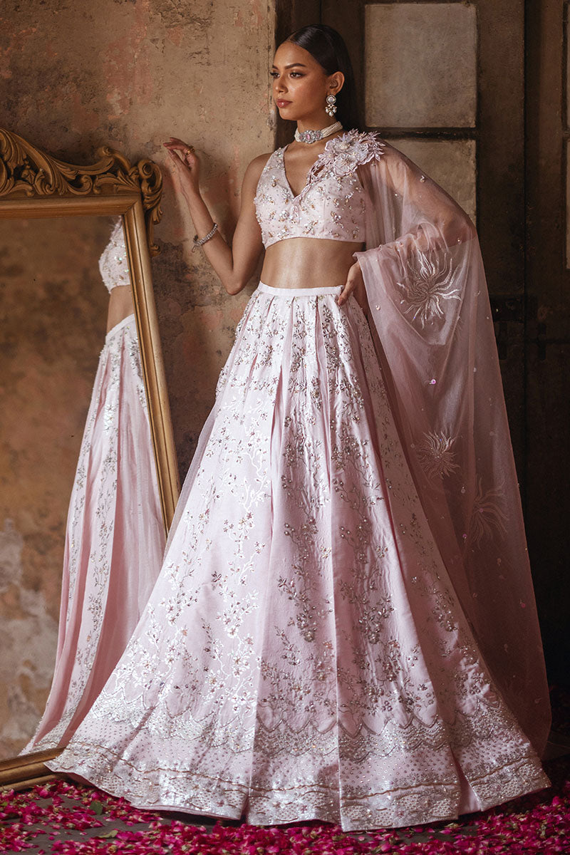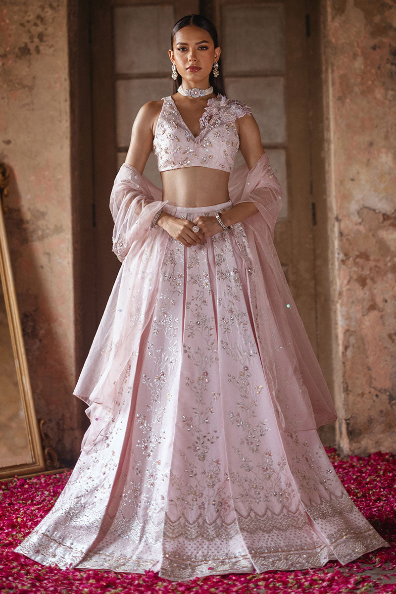 This enchanting outfit features a powder pink contemporary blouse adorned with intricate 3D floral work, complemented by delicate embellishments of pearls and crystals. The blouse is paired with a crushed organza lehenga, elegantly overlapped with embellished screen-printed panels that add depth and texture. Completing the look is an organza dupatta, embellished with matching pearls and crystals, which drapes gracefully to enhance the ensemble’s sophisticated charm.