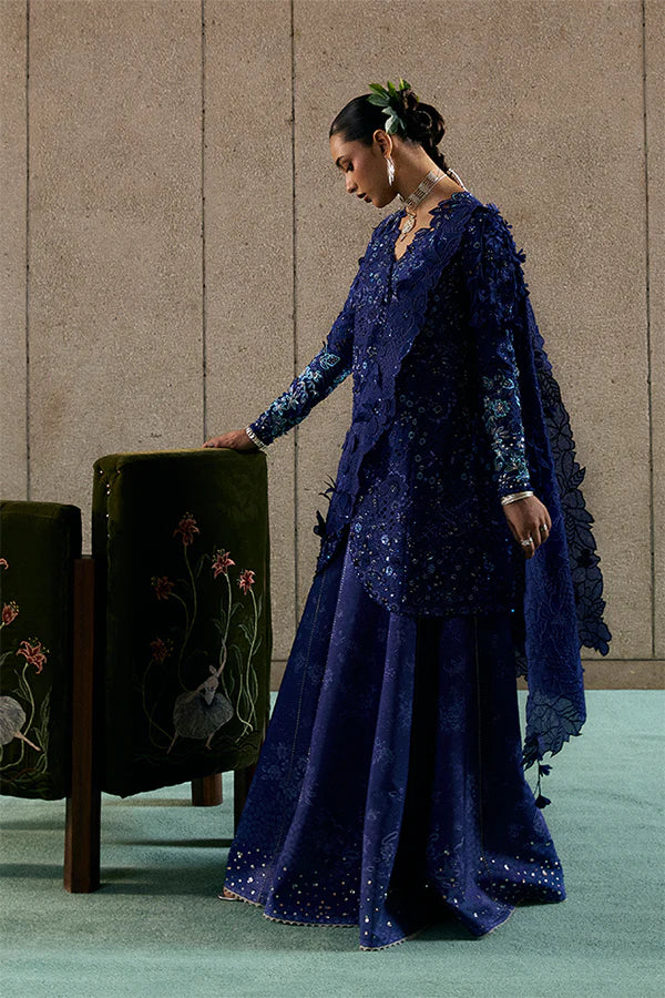 - An indigo blue raw silk angrakha‑style peplum shirt with self‑embroidery, sequins, and cutwork; V neckline trimmed like a necklace; fitted sleeves in lighter blue gradient with 3D organza florals.