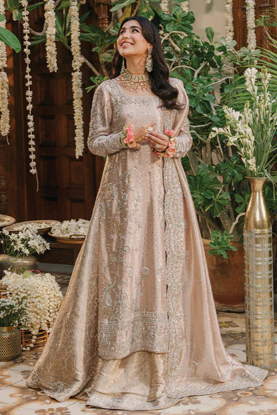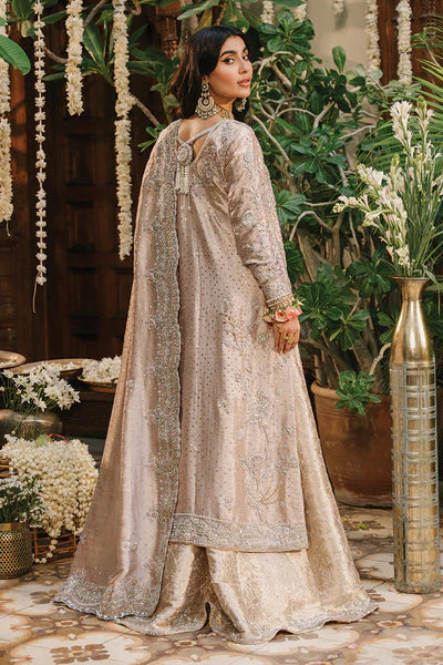 This exquisite formal shirt is crafted from soft pink zari net fabric, renowned for its delicate shimmer and graceful drape. The embroidery features a rich tapestry of dabka, sitara, and crystals, predominantly in silver with subtle touches of gold, creating a luminous, multidimensional effect. Pearl tassels are artfully hung at the back of the shirt, adding a playful yet elegant touch that enhances its luxurious appeal. Paired with the shirt is a jamawar lehenga that exemplifies classic elegance. The lehenga is meticulously worked with delicate embroidery that complements the intricate detailing of the shirt. The zari net dupatta is heavily hand-embroidered with detailed patterns, incorporating the same silver, gold, dabka, sitara, and crystal work as the shirt. This extensive embroidery ensures that the dupatta complements the entire ensemble with its rich, detailed design, adding an ethereal, flowing element to the look. Styling Tip: Achieve a Graceful and Glamorous Look: Opt for sophisticated silver jewelry with subtle touches of gold to match the embroidery on the shirt.