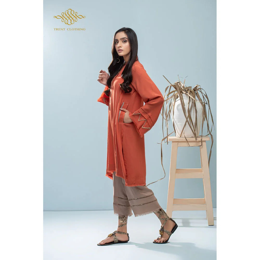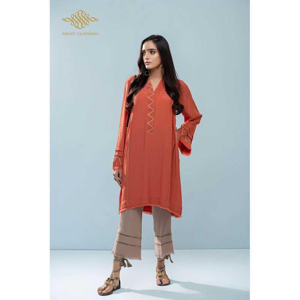 This outfit is a sheer work of art with its vibrant burnt orange color. The shirt is artfully crafted with gorgeous and unique jute details on neck and sleeves with delicate thread work and pleated