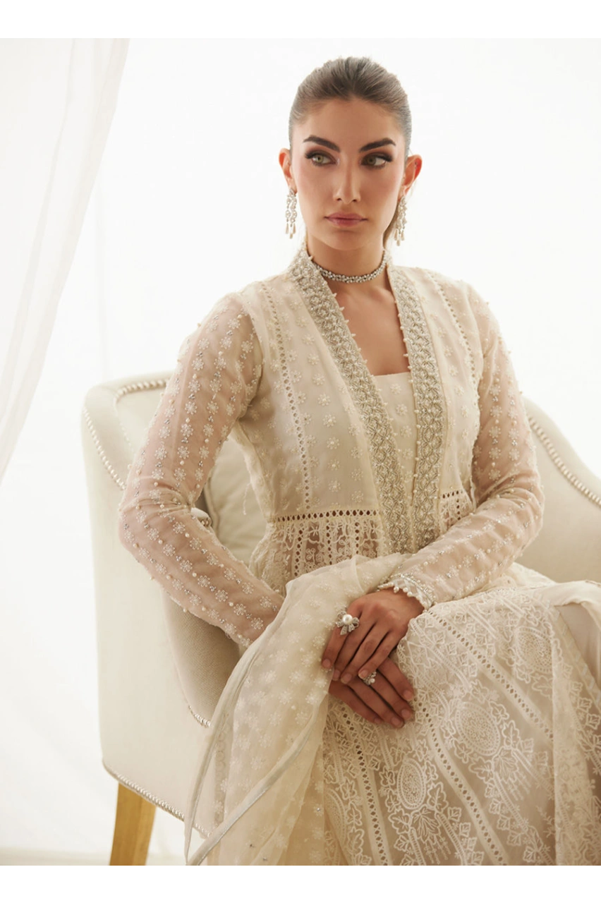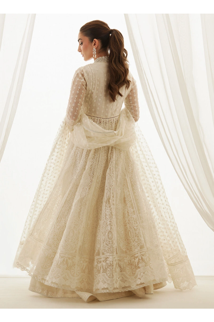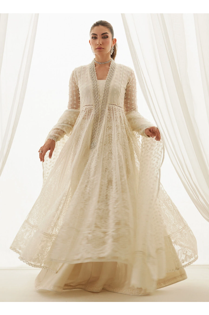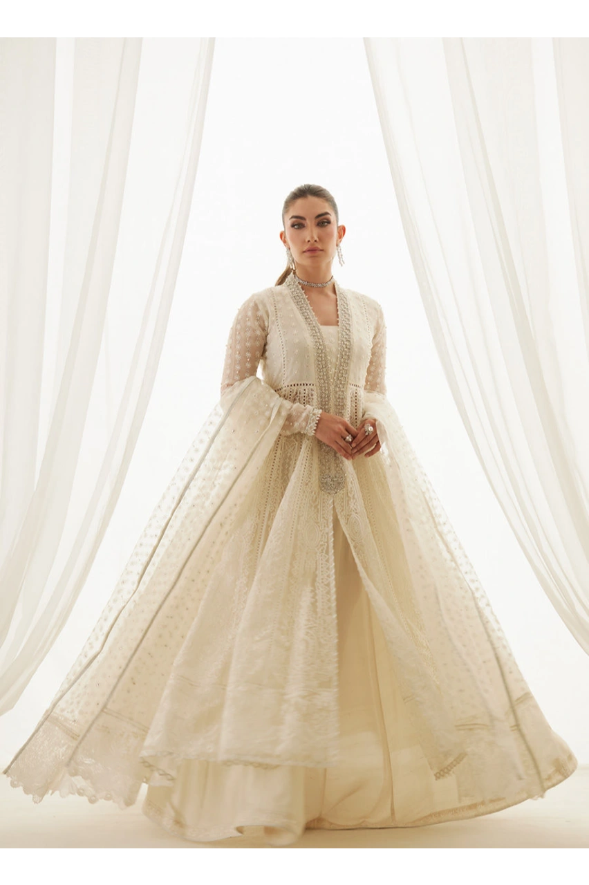 Romantic yet refined, this organza kalidaar is a vision of elegance. The neckline, patti, and sleeve borders are intricately adorned with pearls, sequins, stones, and nakshi, creating a luminous play of texture and light. Paired with a richly embroidered raw silk lehenga and a pearl and stone–embellished organza dupatta, this ensemble strikes the perfect balance between delicacy and grandeur.