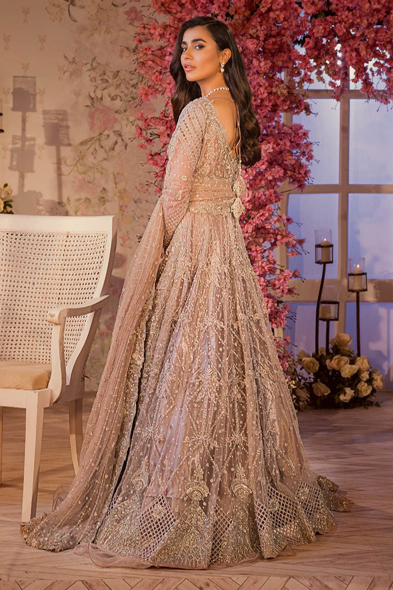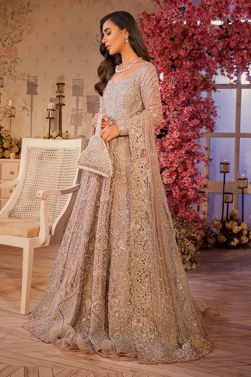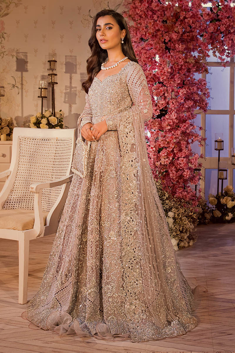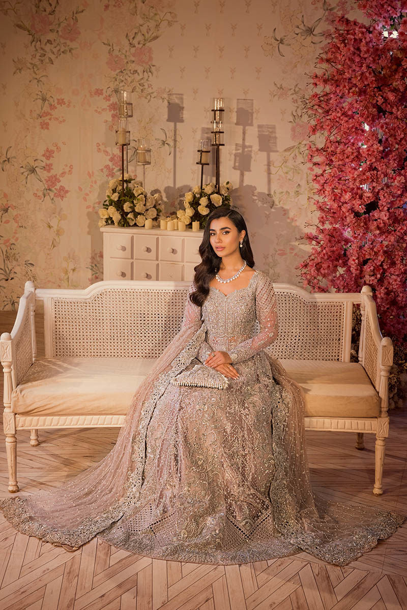 An elaborately hand worked canvas meets a contemporary silhouette with this bridal lavender gown which is made of stiff net and has hand work of zardozi, kora dabka and cut dana all over the gown. It comes with a lame lengha with organza ruffle finishings. Paired with a net dupatta with zardozi hand work.