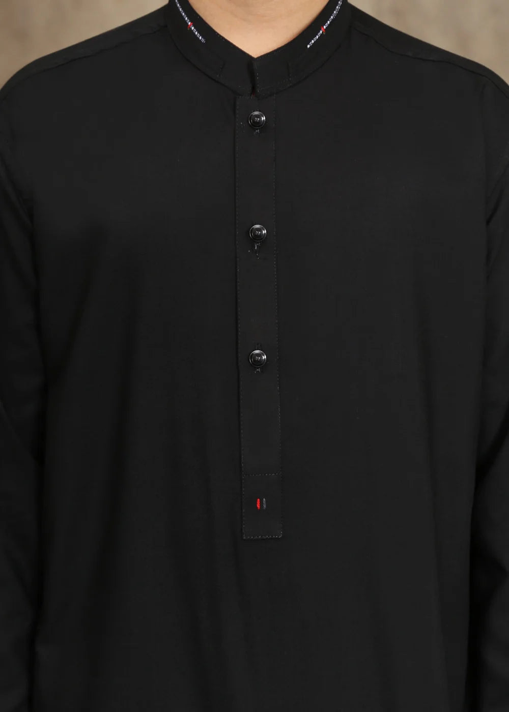 Indulge your little one in the ultimate luxury with our jet black wash'n wear shalwar kameez. Made with premium quality material, it's perfect for all seasons and boasts a stylish bann in design. The intricate thread work and contrasting fabric will elevate their fashion game.