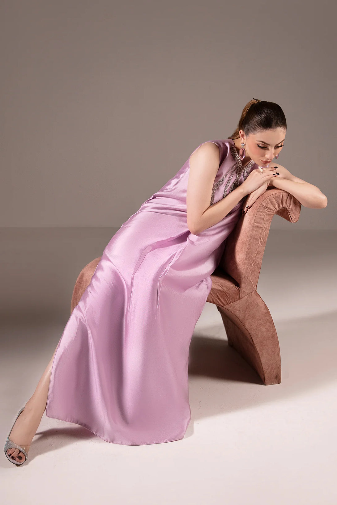 Description: Bathed in a dreamy shade of lilac, this enchanting ensemble is the epitome of sophistication. The floor-length box pleat shirt, paired with sleek straight pants, is crafted from sumptuous silk, flowing effortlessly with every step. The neckline is adorned with intricate 3Dhand embellishments, meticulously arranged in a delicate and unique pattern, adding depth and artistic finesse. Completing the look is a sheer organza dupatta, delicately adorned with sequence spray, lending the perfect finishing touch to this refined and ethereal outfit.