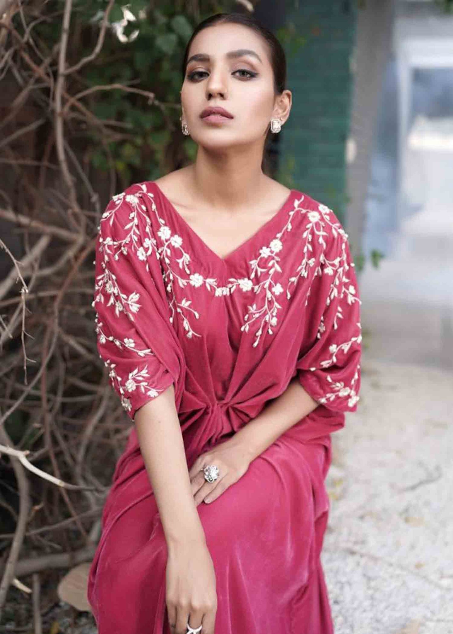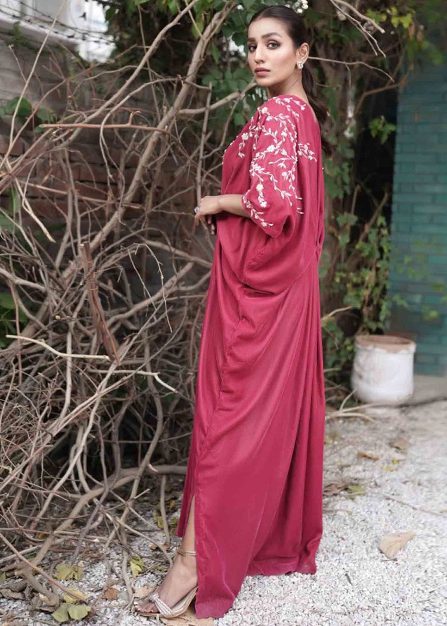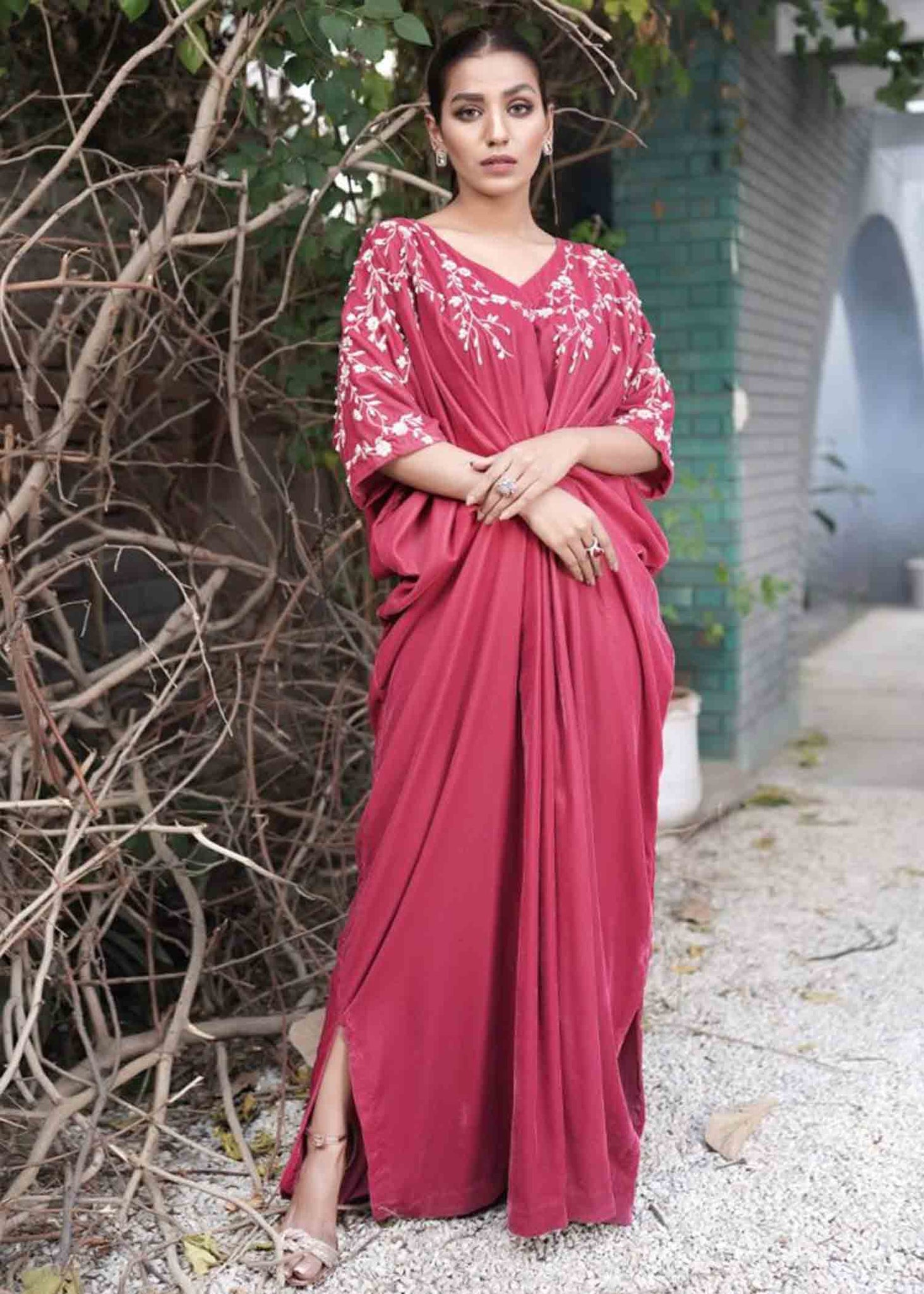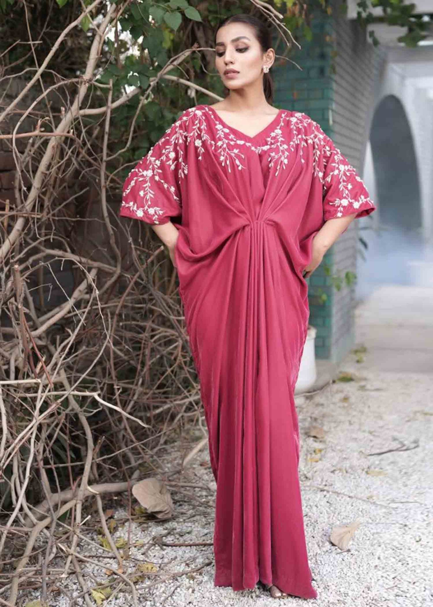 Description: The French word for pink, Rosette, so delicate and feminine is the perfect illustration of this powder pink velvet kaftan.  With reveling floral thread embroidery embellished with crystals and pearls , this exquisite piece is surely a showstopper.
