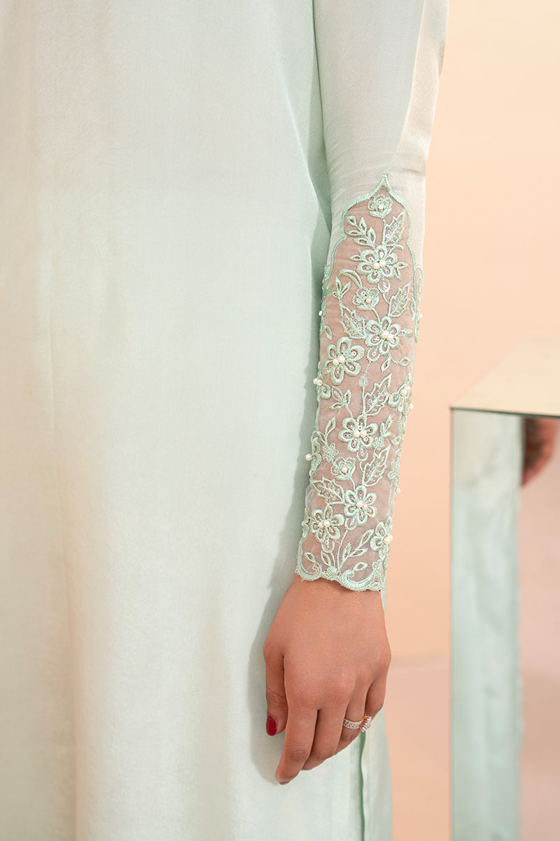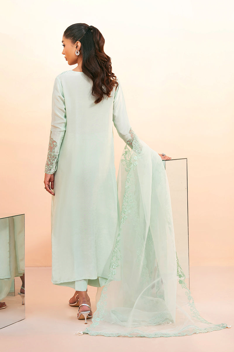 Celebrate Eid in Siara—a dreamy blend of classic embroidery and pastel hues. The pearl-embellished neckline and sleeves add a refined charm, while the matching culottes and ethereal organza dupatta with embroidered borders complete the look, perfect for graceful draping this Eid.