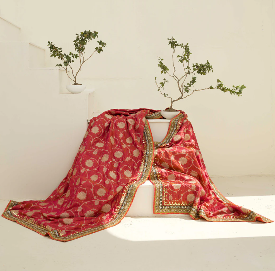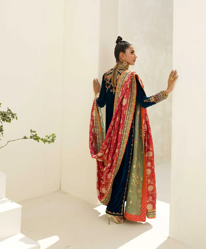 Zara is a pure silk jamawar chaddar with an intricately embellished border on all 4 sides. Do-shaala is lined in green silk with gold print all over. This look merges traditions with modernity making it a signature Aneeka Ruknuddin classic.