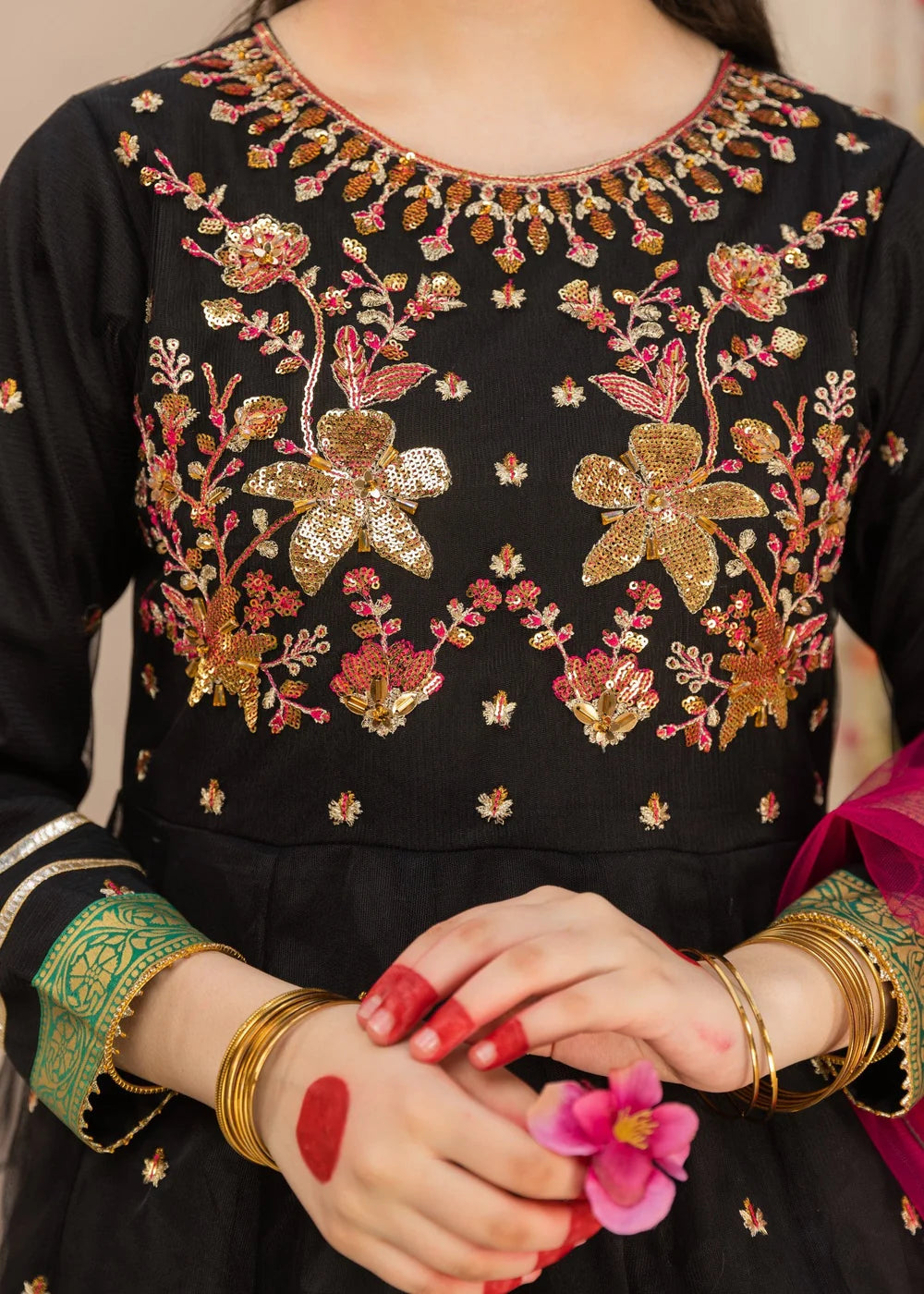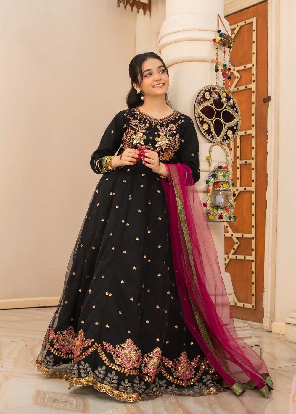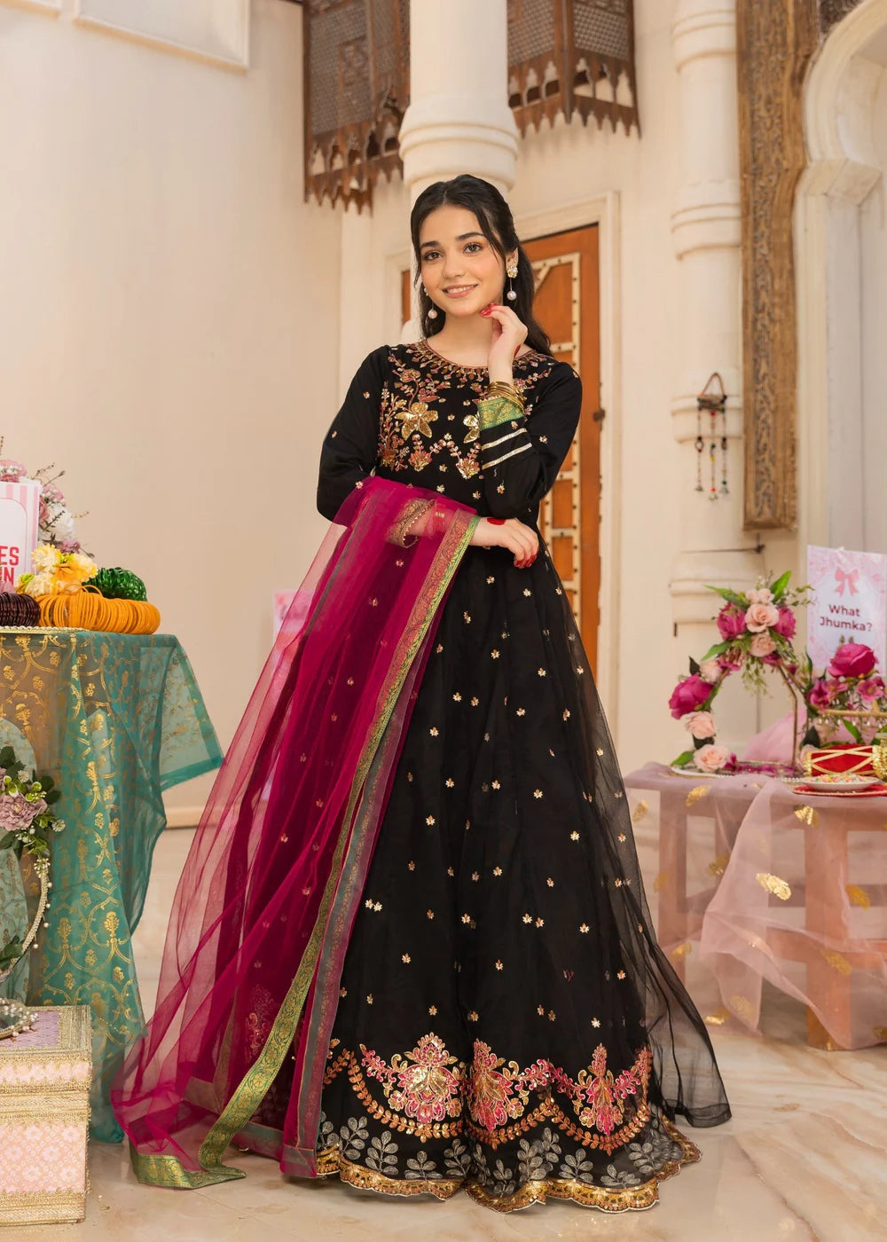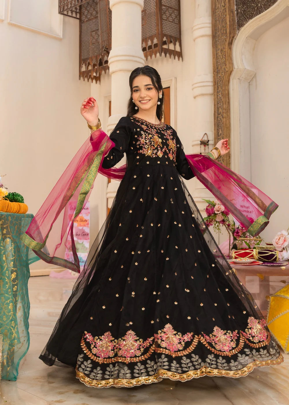 A net pishwas featuring tilla and thread embroidery, beautifully enhanced with handwork of beads and sequins. Paired with a net dupatta, and stitched with grip lining and a cancan border, this outfit exudes elegance and festive charm.
