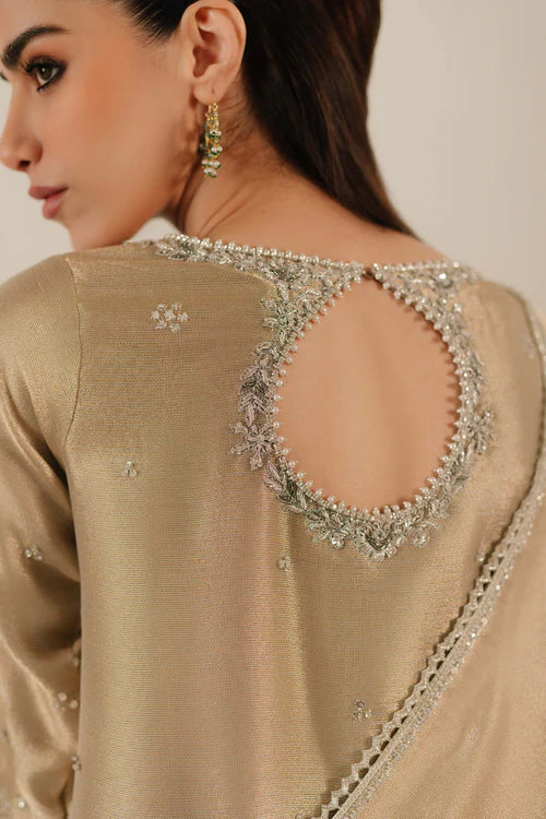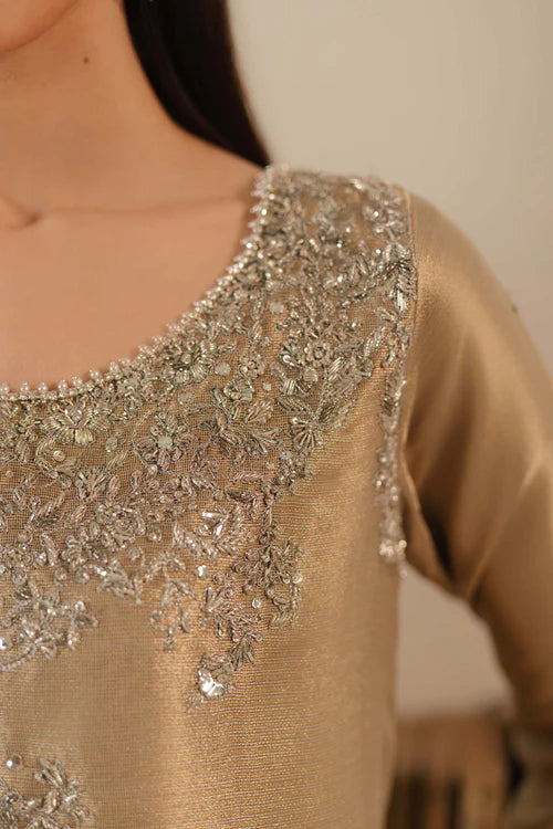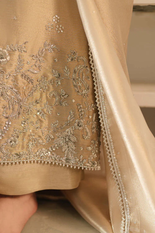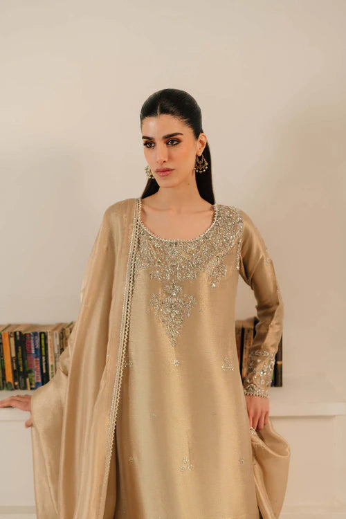 Made from gold zarri-net, this outfit showcases silver hand embellishments. The dupatta features a diamanté spray with intricate handwork, paired with raw silk culottes for a complete look. A design rooted in timeless sophistication.