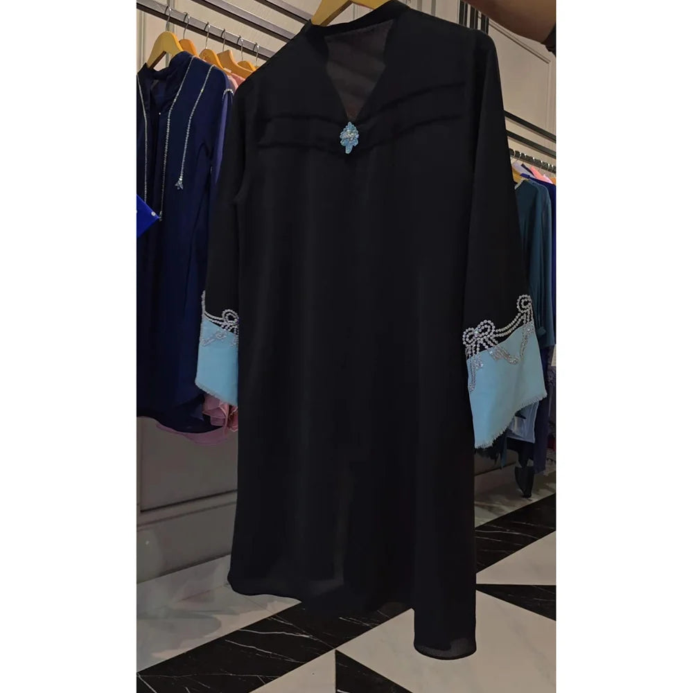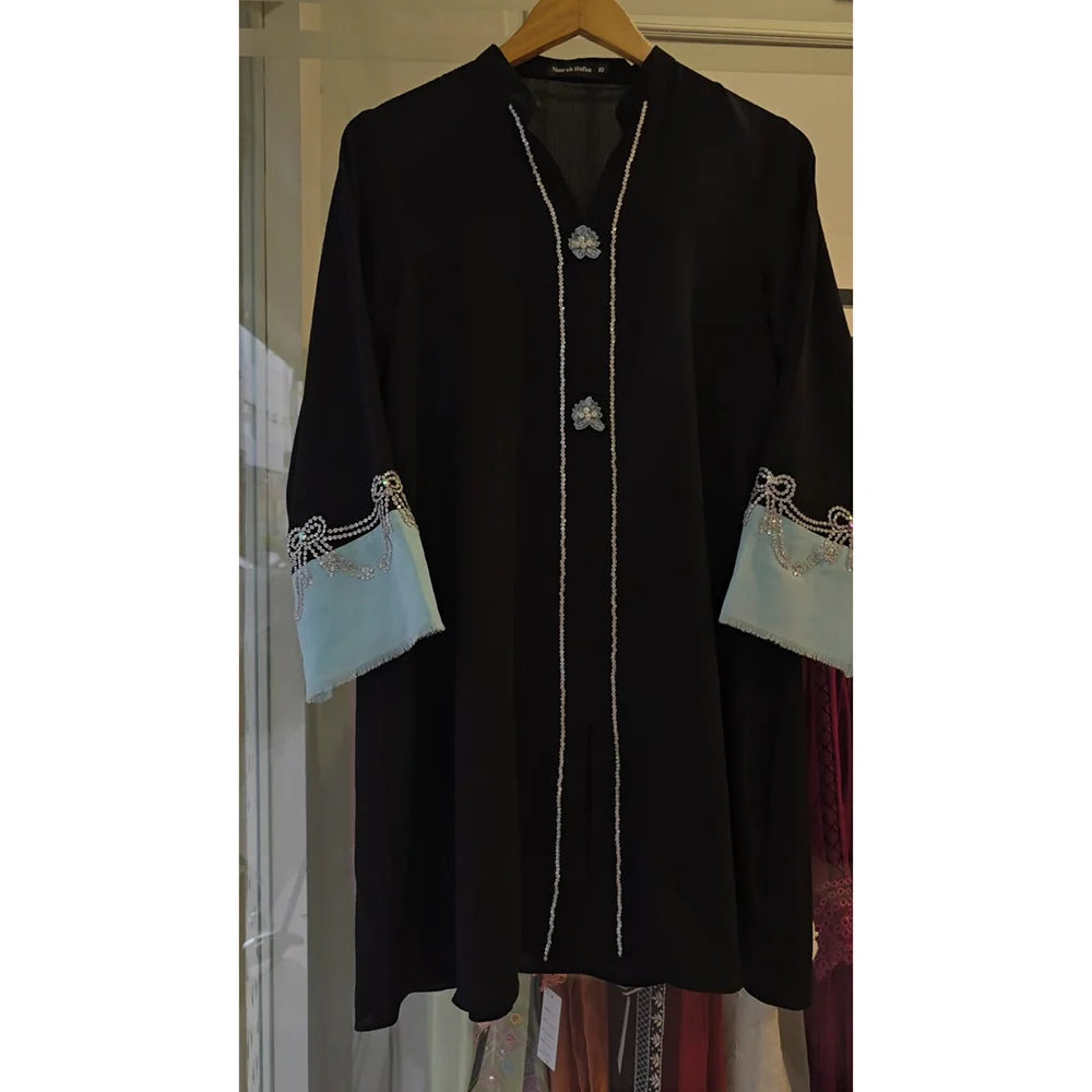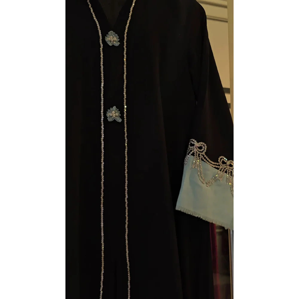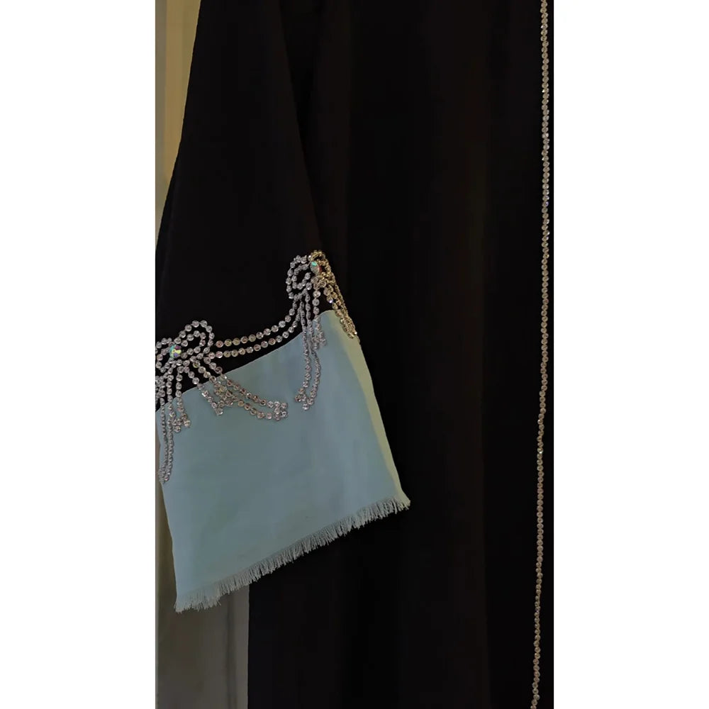 A exquisite Black two piece CO-ORD SET features a stunning swarovski work and handwork flowers on the front Sleeves are adorned with detailed handwork using 100% original swarovski on with a hint of aqua blue .