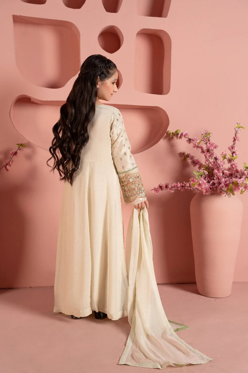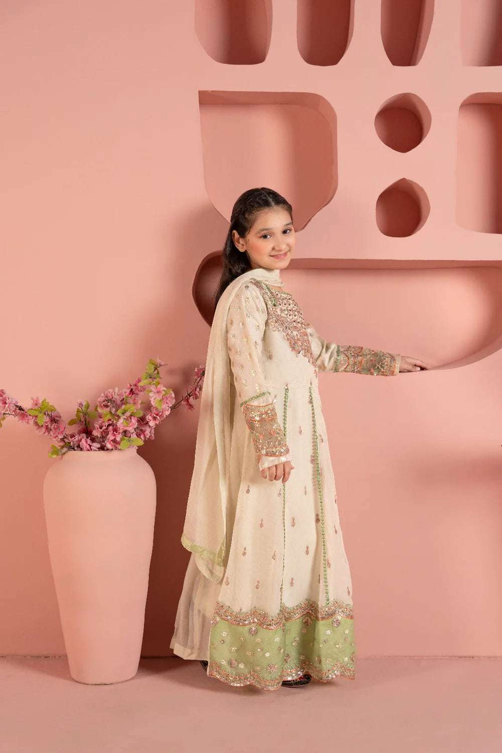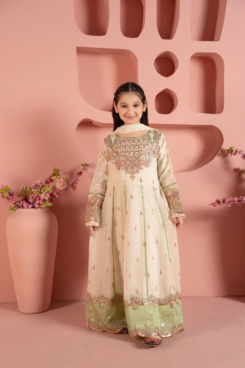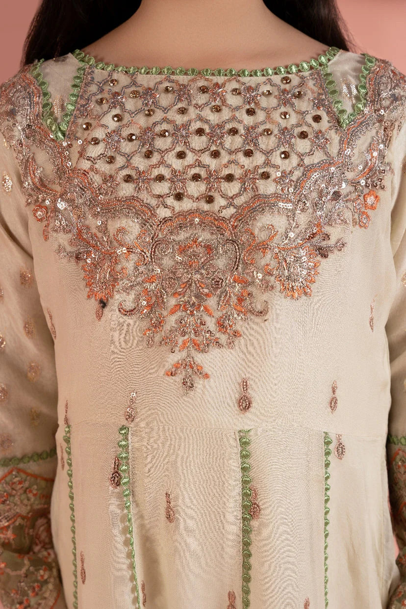 This exquisite festive party wear Pishwas set features a cream-colored chiffon shirt adorned with intricate embroidery details. Paired with elegant Kattan Silk trousers and a matching chiffon dupatta, this 3-piece ensemble exudes sophistication and charm. Perfect for all seasons, this stunning outfit is a true standout piece. Product ID: UKX7626, Brand Name: Sara Jahan. NOTE: Please note that size chart measurements are approximate and can vary by 0.5 to 1 inch due to fabric and hand tailoring.