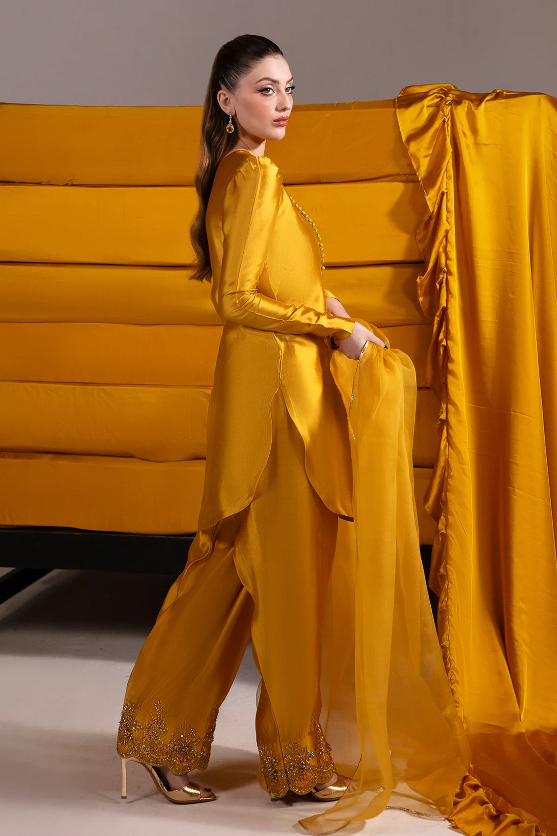 Description: Radiate timeless charm in an exquisite mustard ensemble. The impeccably tailored silk shirt features button detailing on the neckline and sleeves. It comes with a matching shalwar, beautifully enriched with intricately embroidered borders, adding a touchof Completing this masterpiece is a sheer organza dupatta, delicately finished with gottalace detailing, creating a mesmerising aura of grace.