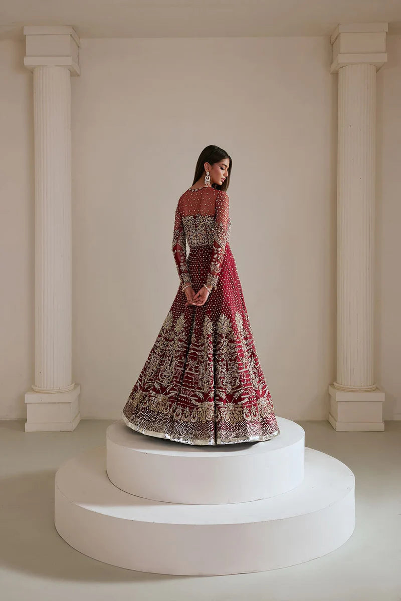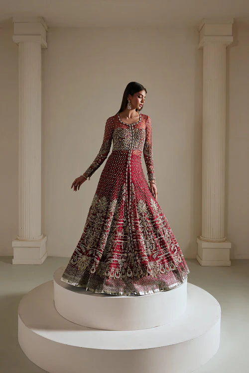 A stunning red pishwas paired with a beautifully flared lehnga and a graceful dupatta — this outfit is a perfect blend of tradition and modern elegance. Adorned with exquisite zardozi and kamdani work, every detail reflects fine craftsmanship and regal charm. The intricate handwork and classic silhouette make it an ideal choice for weddings or festive occasions, offering a look that is both timeless and contemporary.