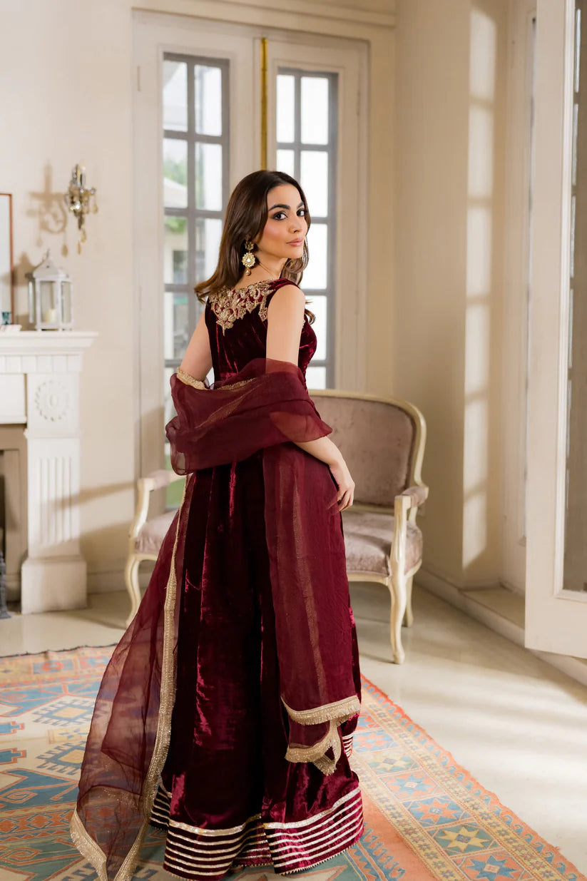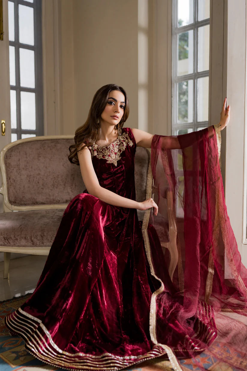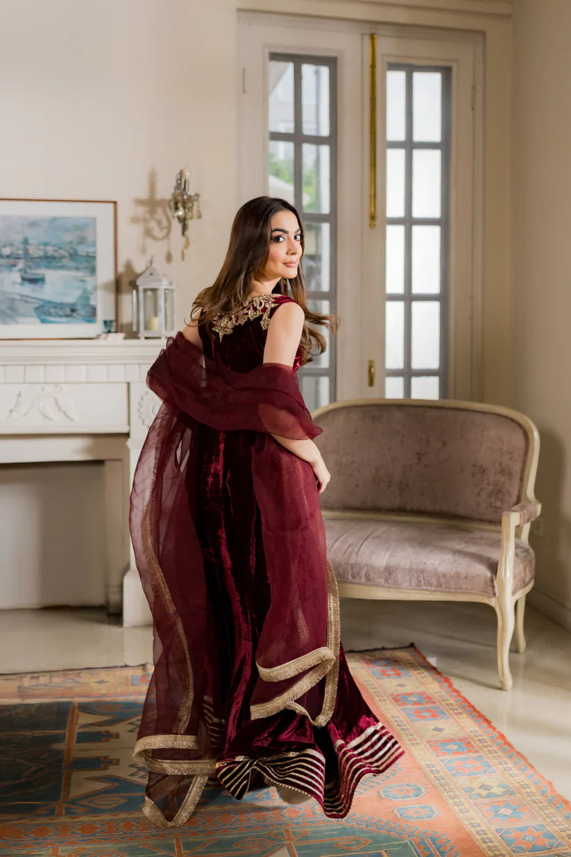 Flowy, regal, and drenched in gold handwork — every dabka and zarrī stitch tells a story of timeless craft. Paired with a sheer organza dupatta that whispers elegance, Mira is the maroon muse of this shaadi season — rich, radiant, and unforgettable.