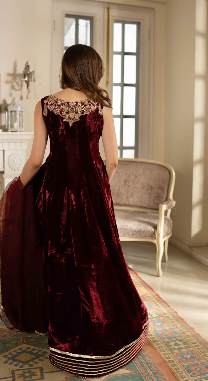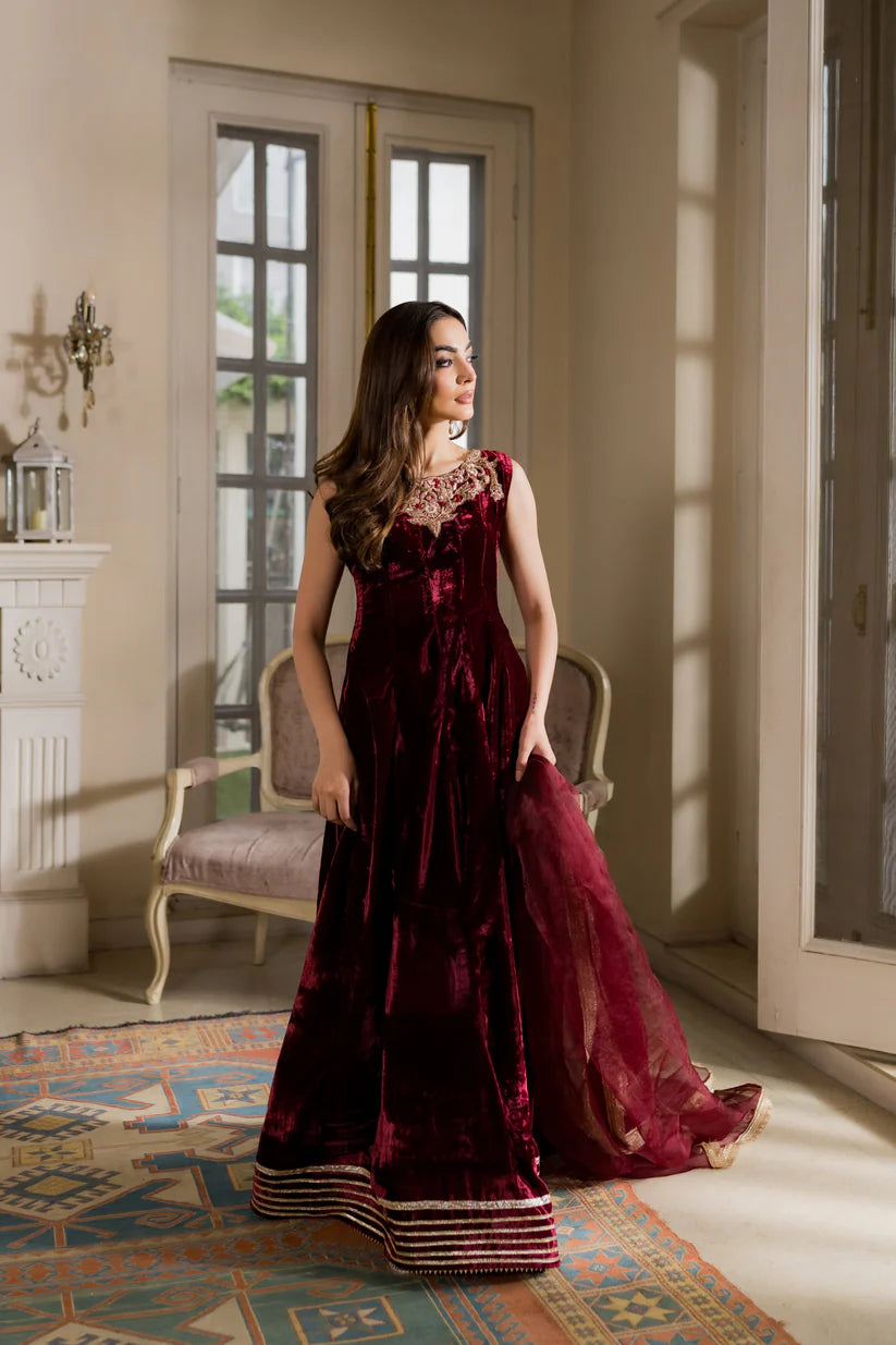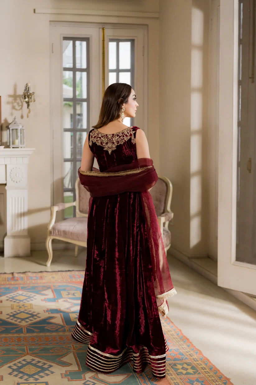 Flowy, regal, and drenched in gold handwork — every dabka and zarrī stitch tells a story of timeless craft. Paired with a sheer organza dupatta that whispers elegance, Mira is the maroon muse of this shaadi season — rich, radiant, and unforgettable.