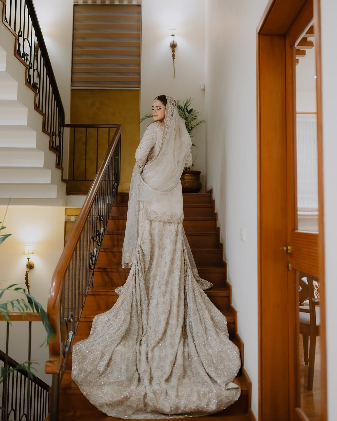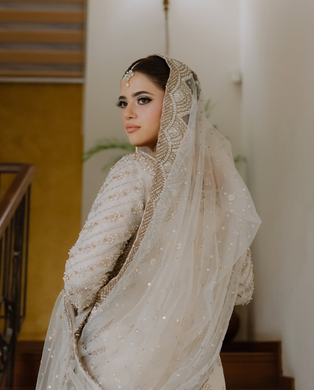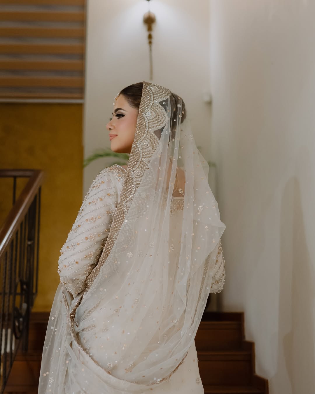 A masterpiece of artisan craftsmanship, meticulously brought to life over countless hours. Featuring shimmering sequin kat dana work that catches the light with every step, a flowing trail that adds a touch of grandeur, and a mermaid silhouette that enhances the bride’s poise and grace.