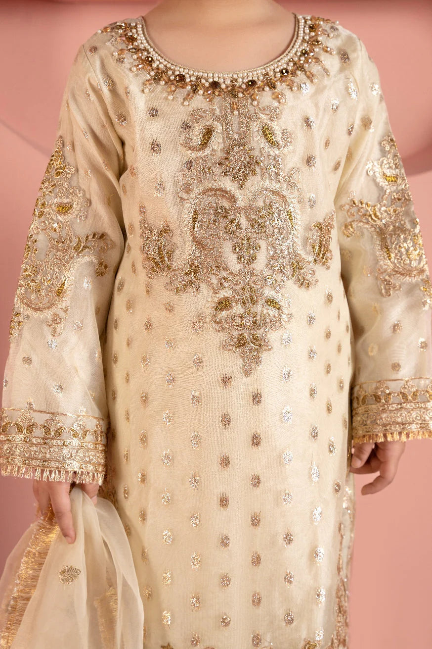 This exquisite Gharara set is a stunning choice for weddings and formal events. Crafted from luxurious Organza and Banarsi fabrics, the cream-colored ensemble features intricate embroidery and bindi details on the shirt. The Gharara bottom adds a traditional touch, while the matching Organza dupatta completes the look. Perfect for all seasons. (Product ID: YWH9920, Brand name: Sara Jahan) NOTE: Please note that size chart measurements are approximate and can vary by 0.5 to 1 inch due to fabric and hand tailoring.